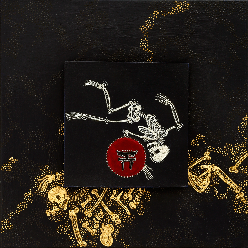 Ink, Ink, acrylic, gesso and gold leaf on museum board, 28"x28"